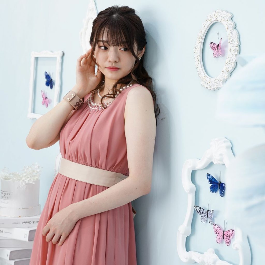 ピンク系にはパールアクセサリーがよく合います。また、ヘアスタイルも柔らかいカールでまとめると全体的なバランスが取れます。