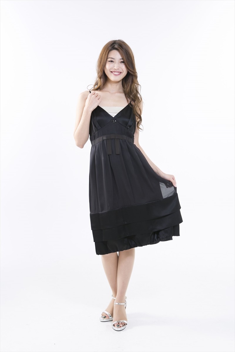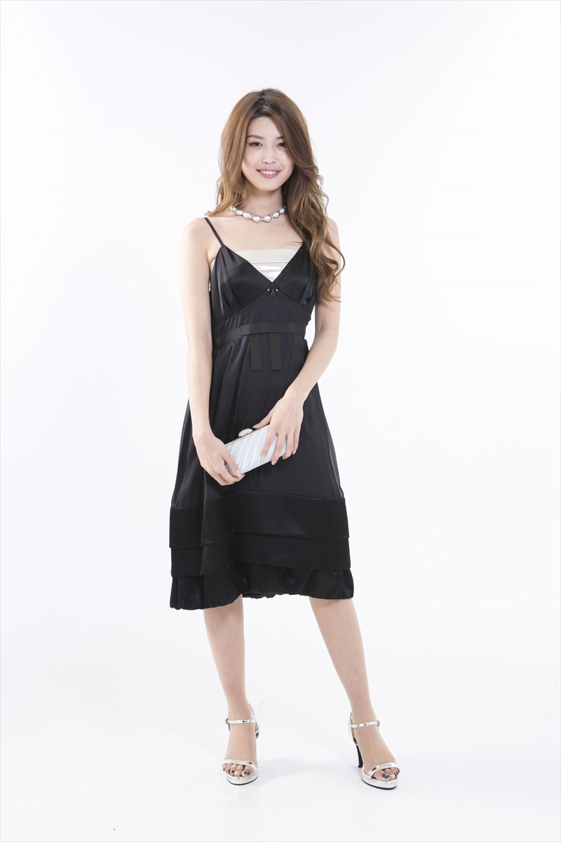 ・こだわりの光沢素材が採用され、高級感のあるブラックドレスです。