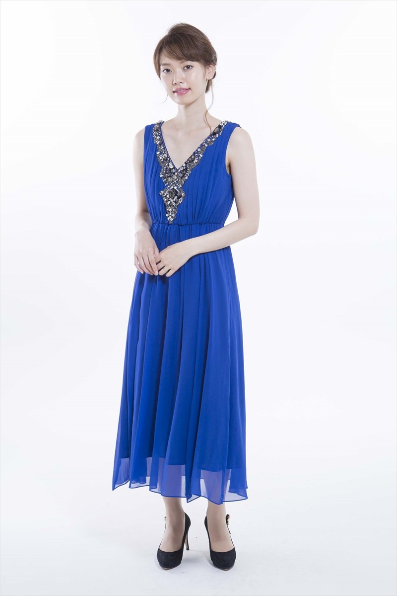 ・フロントビジューと深めのVネック&Vバックが女性らしさを演出します。