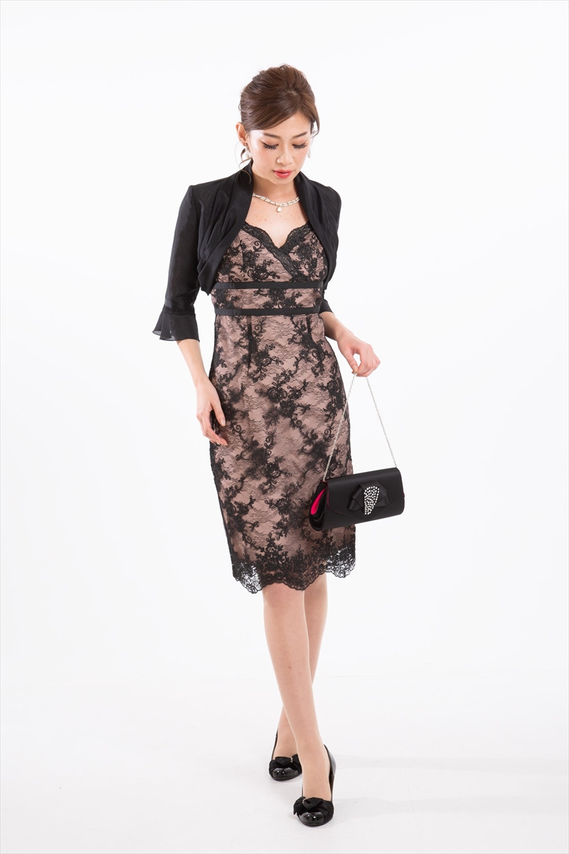 ・ピンクベージュの素材にブラックレースが重なったエレガントな一枚。