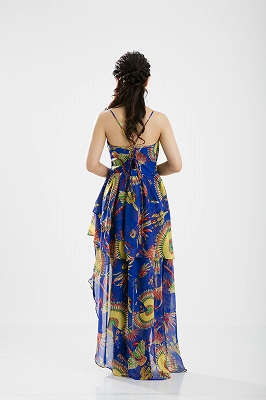 ・生地のインディアン羽デザインが印象的な、パッと目を惹くアシンメトリードレスです。