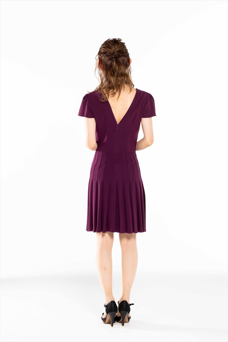 ・背中部分のV開きで後ろ姿もさりげなく女っぽく、そしてプリーツスカートになっているので、正面からとはまた違った表情を見せてくれるさすがのデザインです。