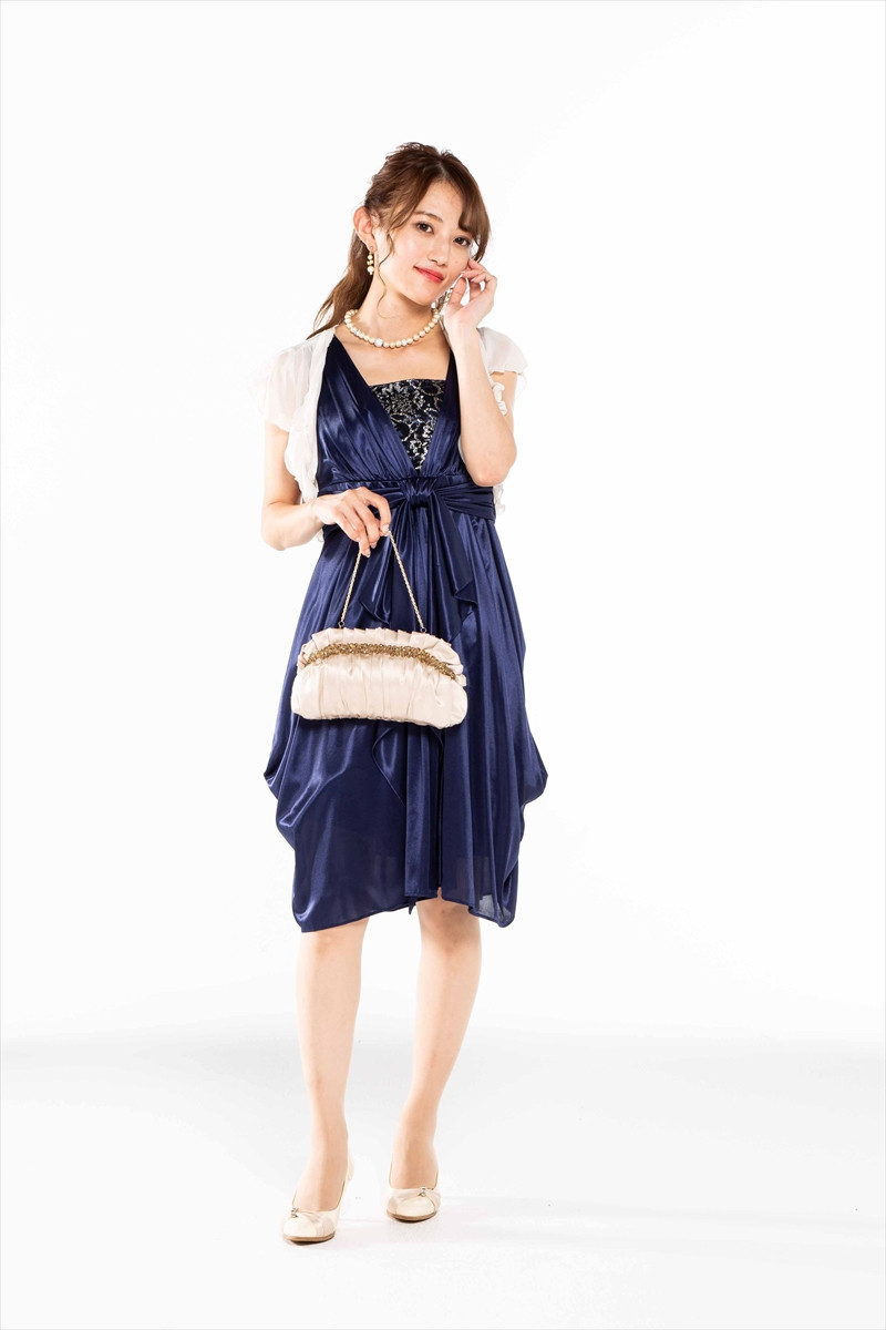 ・光沢のある華やかなネイビーのドレスです。