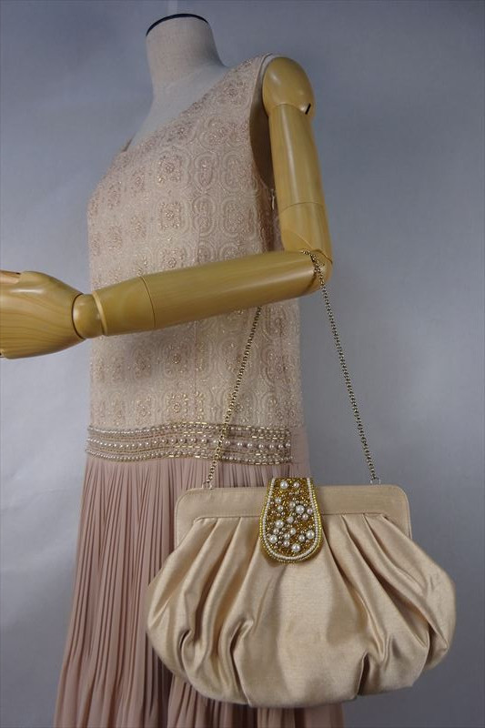 ・光沢サテンと、留め具のゴールド&パールビジューが華やかなパーティバッグです。