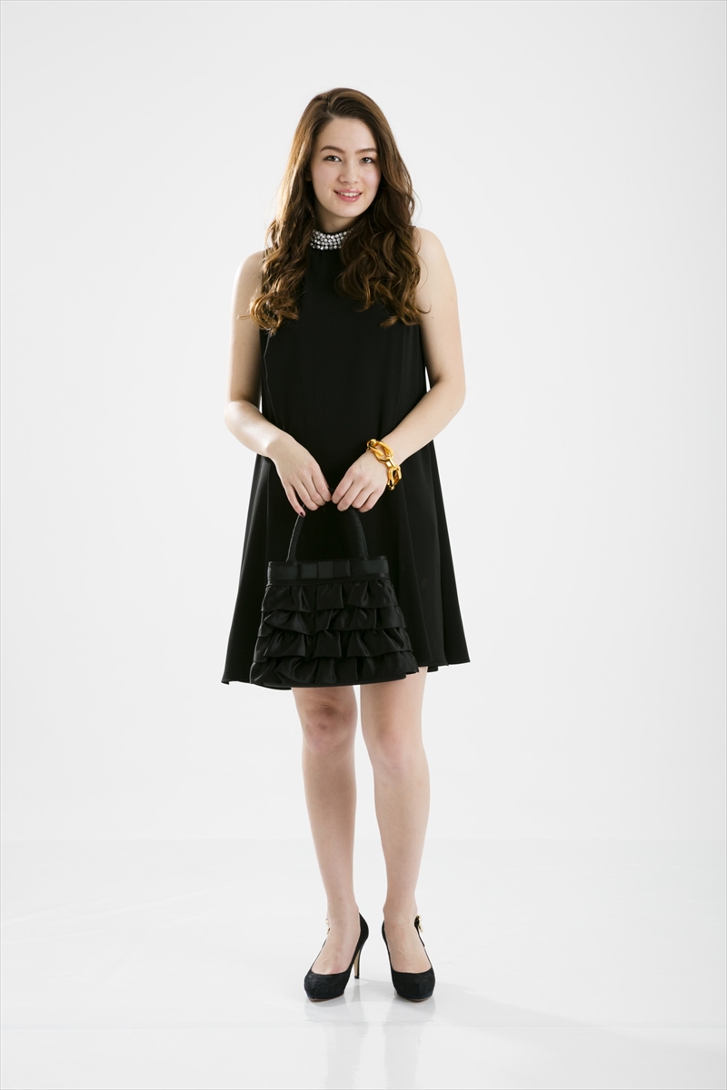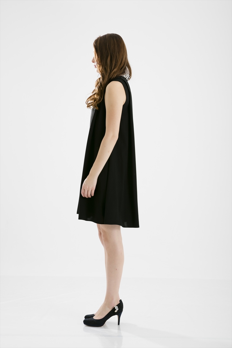 ・首元にパールと大き目ビーズが装飾されたAラインのパーティードレスです。