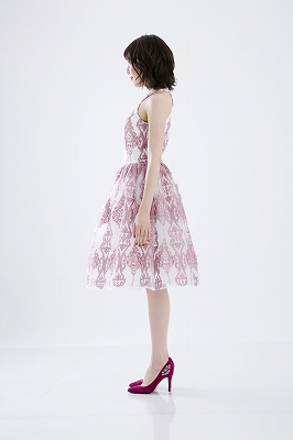 ・白生地にピンクのダマスク柄刺繍が施されたドレスです。