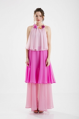 ・パッと目を引く3色ピンクのフレアロングドレスです。