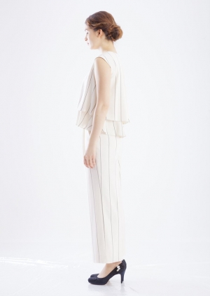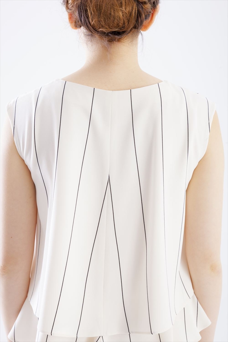 ・トップスの裾のフリルとオックスフォードパンツがドレッシーな一着です。
