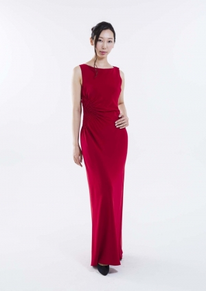 ・片側ウエスト部分のギャザーデザインと足元に向かってやや広がるシルエットが美しいドレスです。