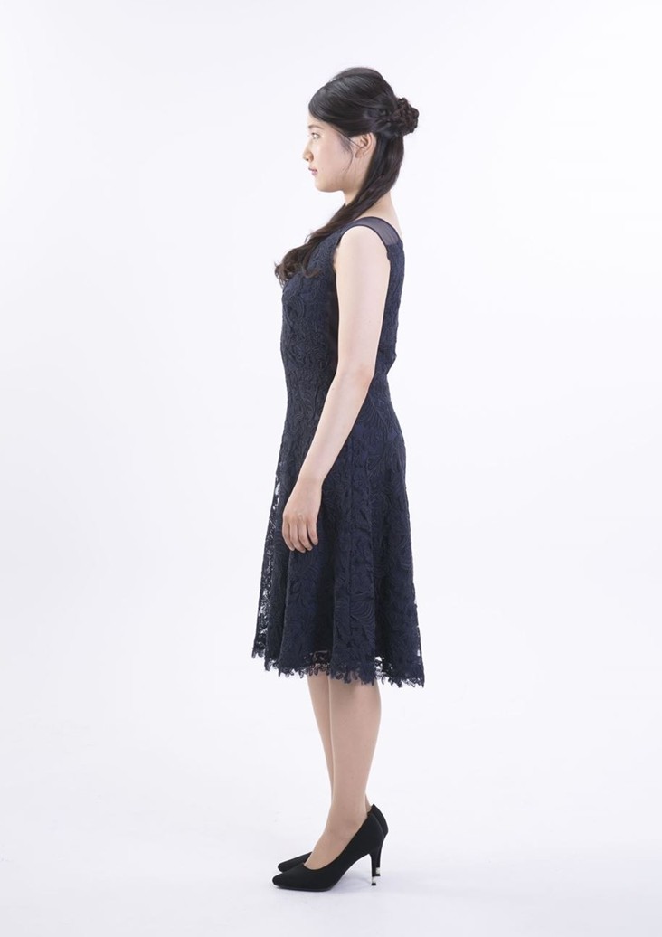 ・立体感のあるレース素材と肩&ボディサイドのメッシュが素敵なドレスです。